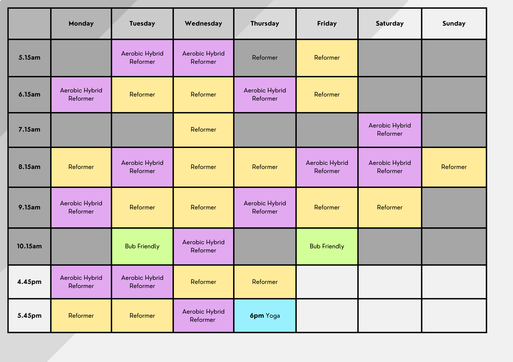 All classes are 45 minutes in duration. Please arrive at least 5 minutes prior to class.